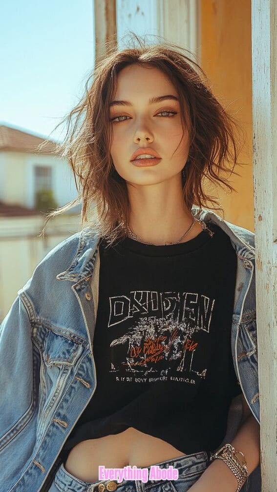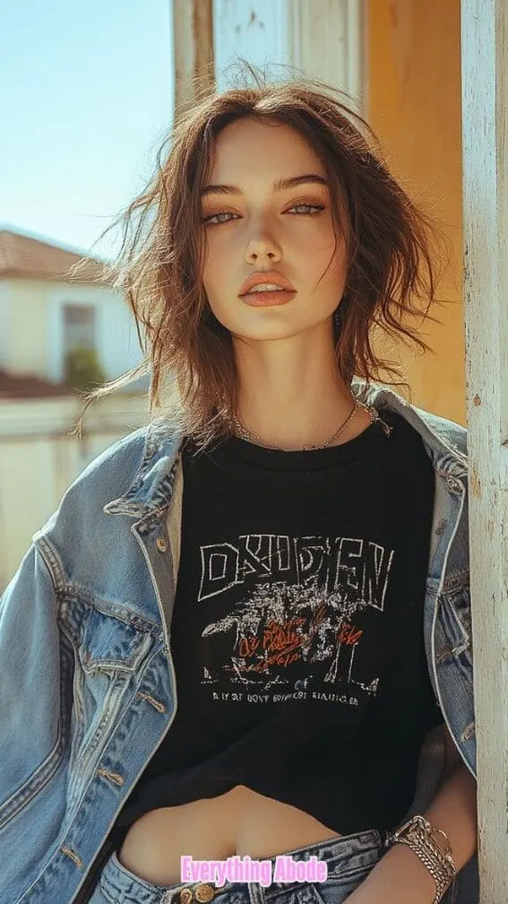 This stylish fall outfit combines an iconic denim jacket, an edgy graphic t-shirt, and high-waisted black skinny pants. A distressed edge on the hems of these jeans gives an edge of edginess, and the white sneakers give off an edgy, laid-back look. A sleek crossbody bag with chains adds a touch of class to the overall look, which makes it an excellent choice for casual outings or an afternoon coffee. With the help of aviator sunglasses and a few accessories, this look combines fashion and comfort and is effortlessly ideal for casual fall clothes.