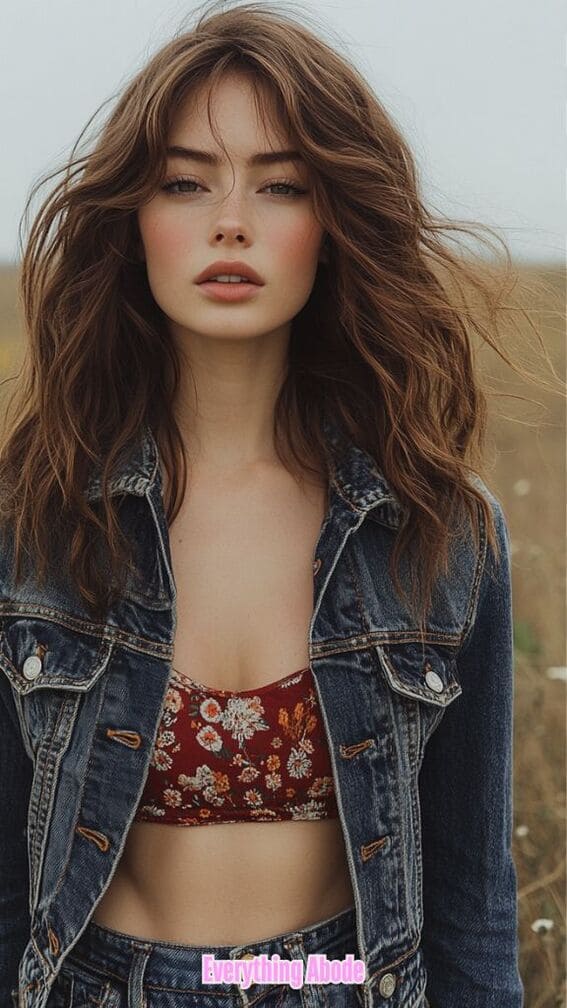 This striking denim jacket elevates fall fashion with extravagant embroidery and intricate fringe details. The vivid patterns and textured embellishments on the sleeve and back give the jacket a boho chic style, making it a statement piece. When paired with a plain white bathing suit underneath, it’s a stylish and comfortable look, perfect for adding a touch of boho style to a casual day by the ocean. This stunning style celebrates the unique and artistic style with an edgy edge.