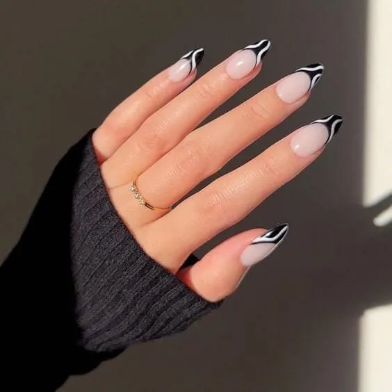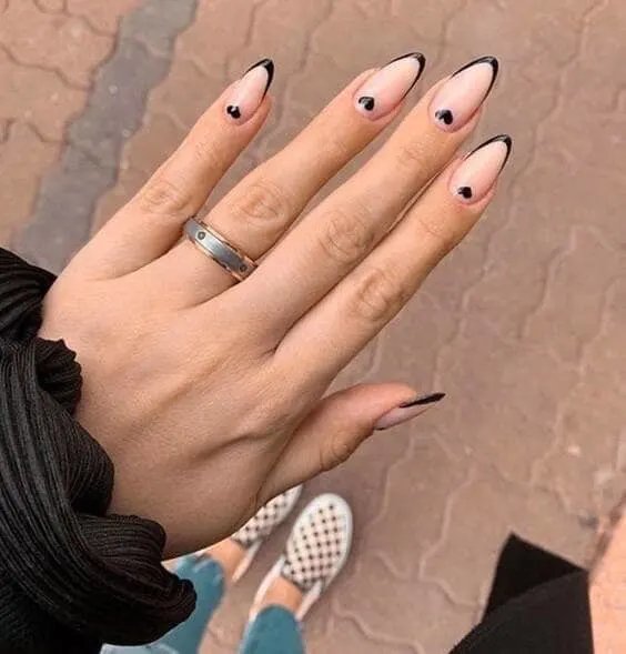 Your classic black tips and sheer gloss polish with round almond-shaped tips.