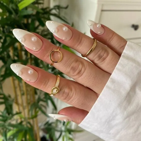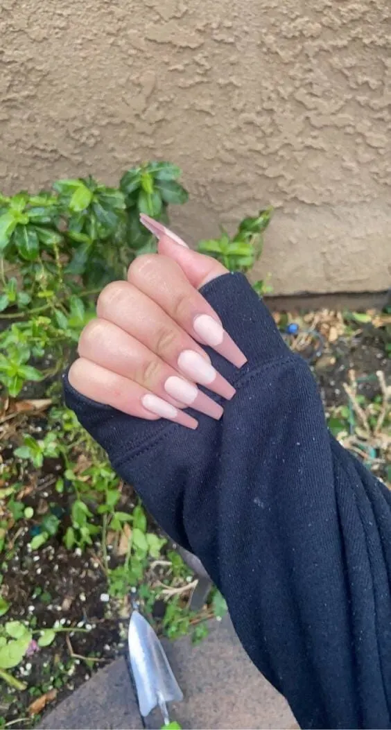 With a classic oval shape, these nails are finished with a light coat of glossy baby pink nail polish. The subtle white tips blend in with the pink base nail polish. This natural look is perfect for those who want a timeless look that still fits today’s nail colors.