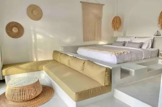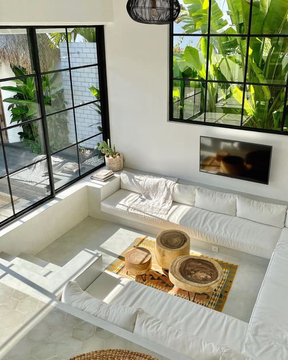Step into this living room, and you’ll be met by an airy white color scheme, creating a fresh and airy ambiance. However, the sunken seating area truly distinguishes this space from others – adding depth and dimension to the entire villa.